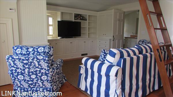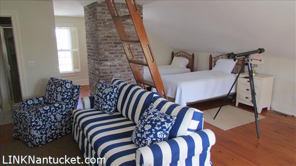 Large open room with twin beds, sitting area with custom book shelves, closets/storage, full bath and the ladder to access the widows walk for evening sunsets.